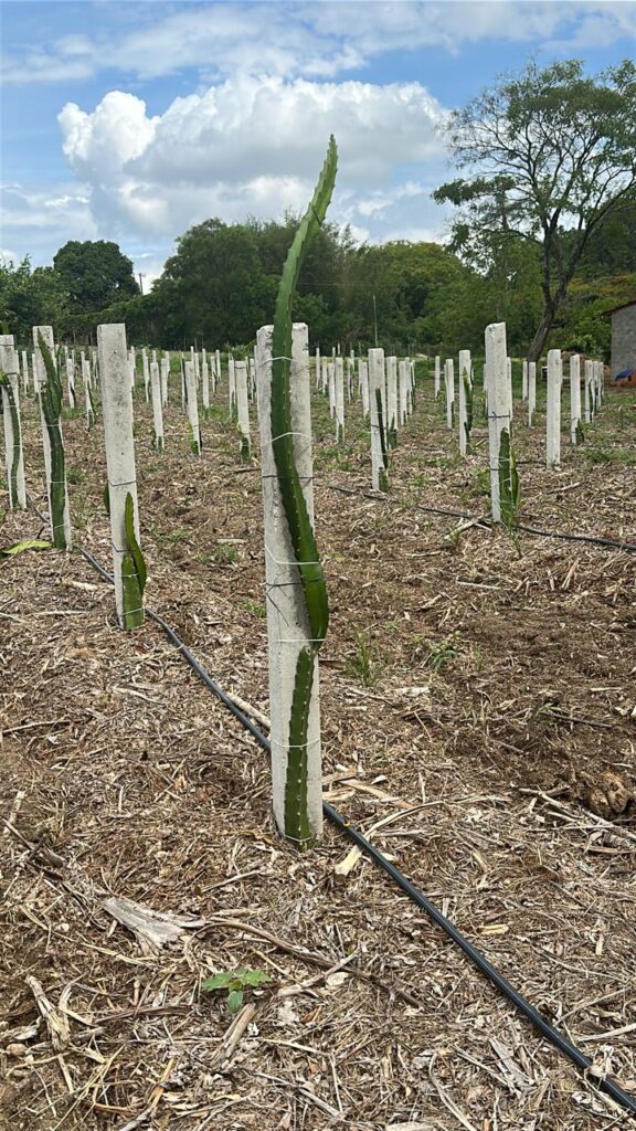 Dragon Fruits grow on a cactus and require support due to the weight of the plant and fruits